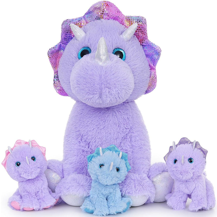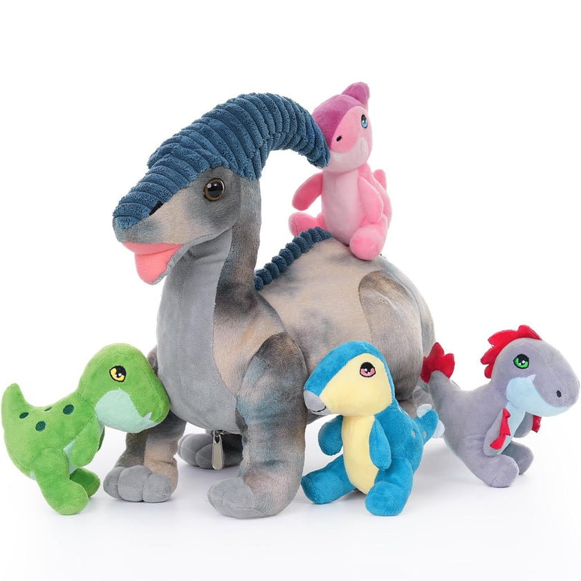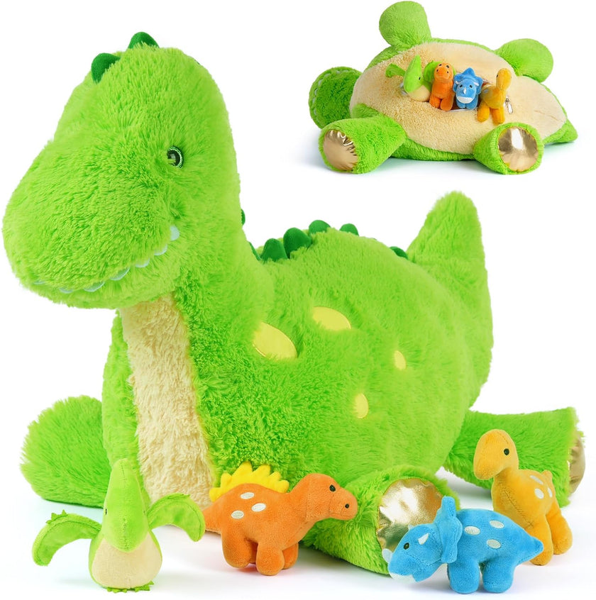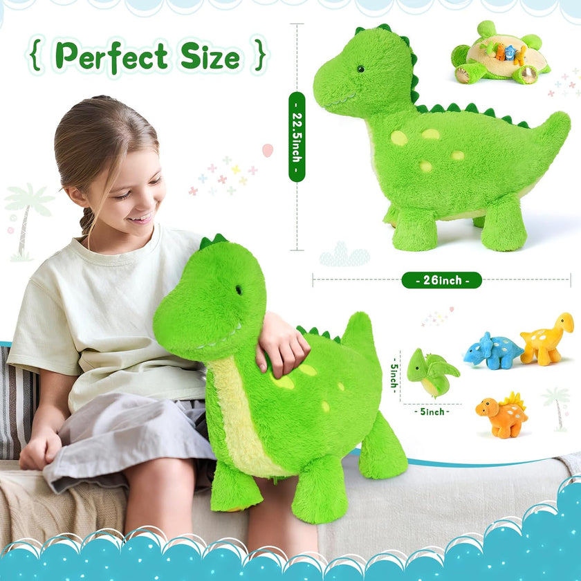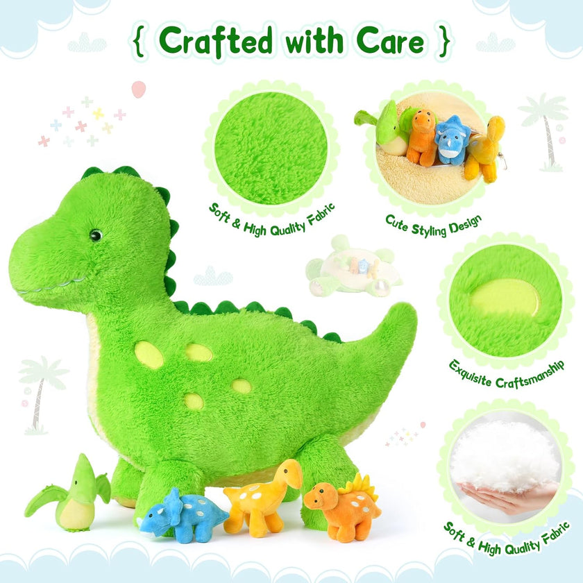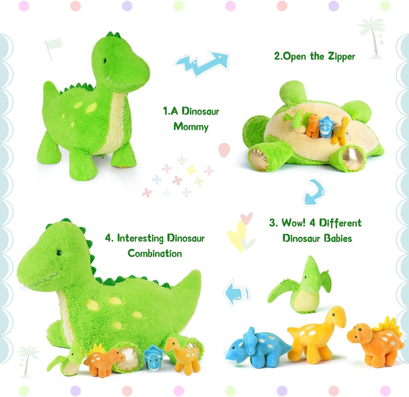 Dinosaur Plush Toy with 3 Baby Dinosaurs, Green/Pink, 17.6 Inches