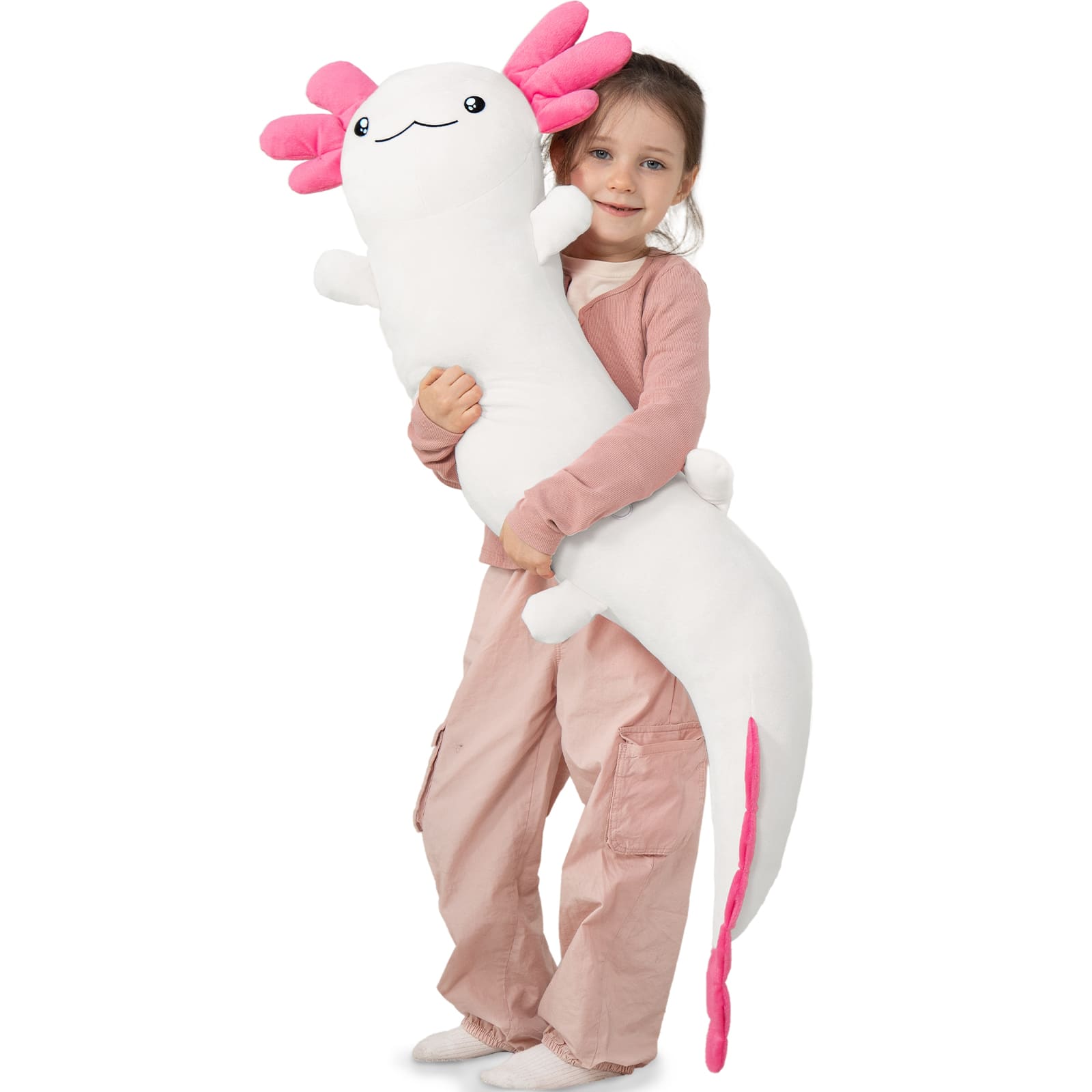 The Axolotl Plush Toy is adorable! It's made with 100% PP cotton, making it extra soft and huggable. Not only is it a funny and lovable plush toy, but it also doubles as a cozy throw pillow. Measuring 48 inches, it's the perfect size to snuggle up with. Plus, it's super lightweight, making it easy to take along wherever you go. Get ready for a cozy and friendly companion!
