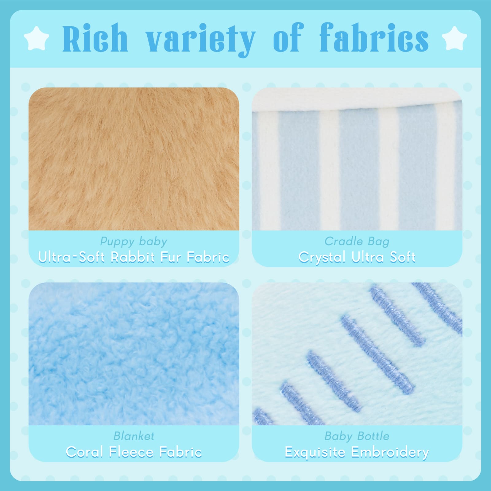 ▪️ Fabric Doll Set includes a cloth doll, a dress, a pillow, a blanket, a plush bottle, and a tote bag.